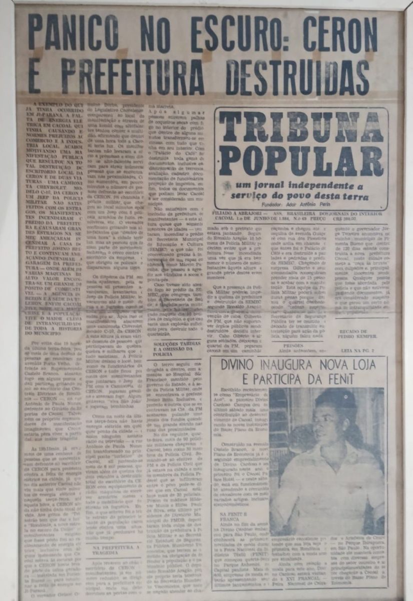 A edição do jornal “Tribuna Popular” no dia 1º de junho contou a história, sob a manchete “Pânico no escuro – Ceron e Prefeitura destruídas”.