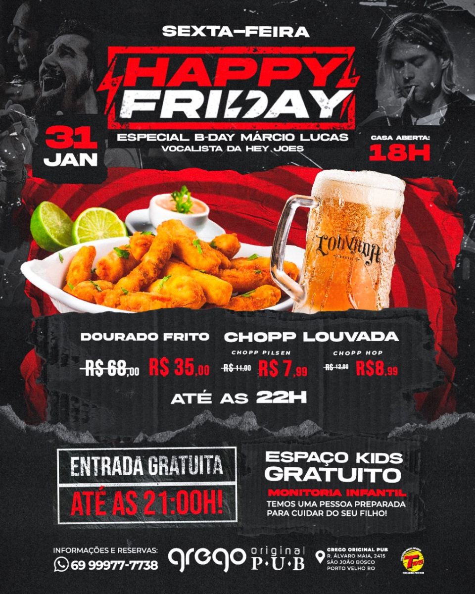Nossa sexta-feira é conhecida pelo seu happy hour, então não tem erro se você quer tomar uma cervejinha gelada e curtir um petisco, tudo isso com descontos incríveis!