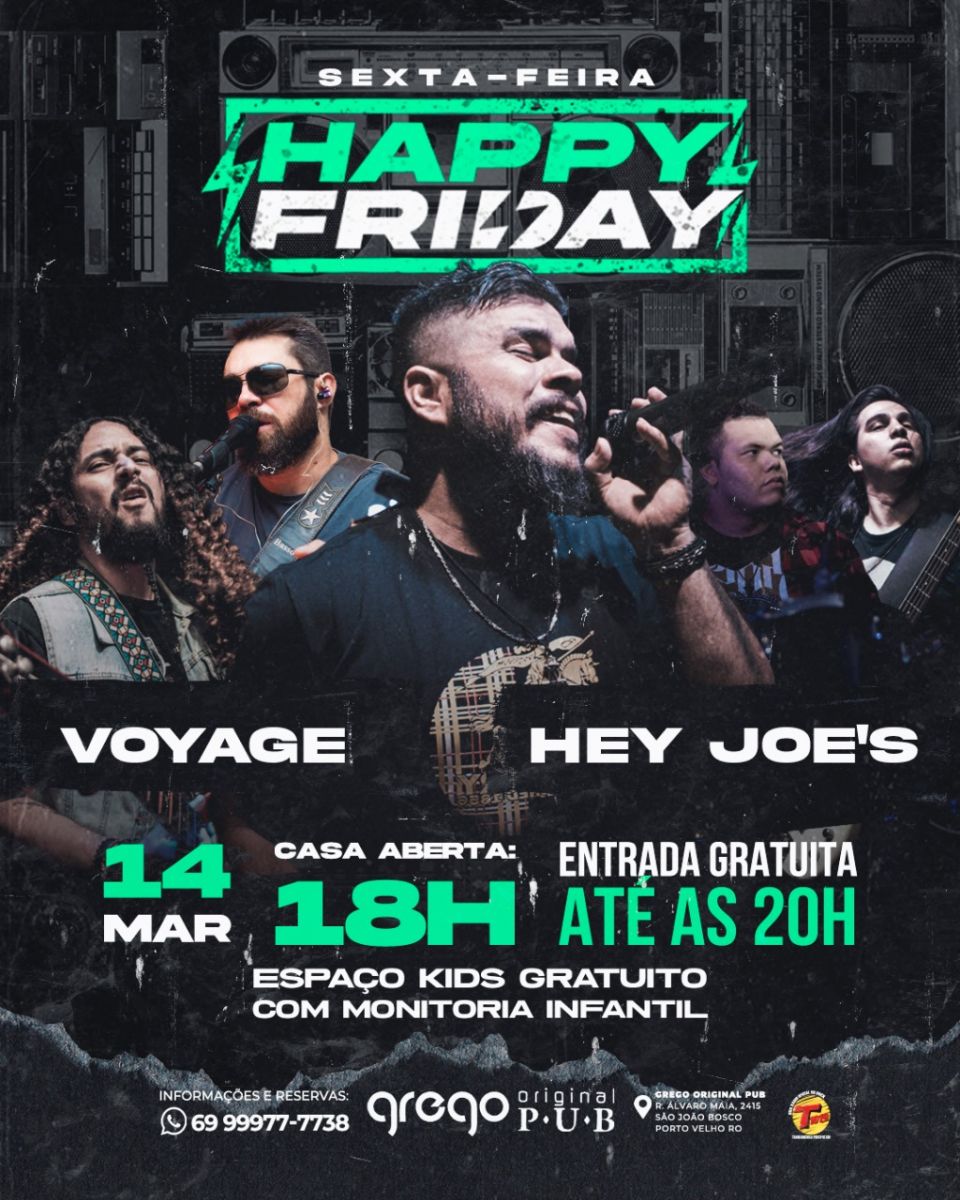 De atrações músicas, essa sexta feira conta com banda Voyage e banda Hey Joes. Chegue até às 20h e não pague sua entrada.