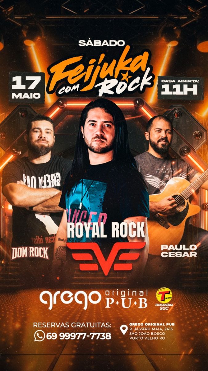 Pra quem curte a programação musical, banda Dom Rock e banda Royal Rock no palco principal. No espaço lounge, Paulo Cesar acústico.