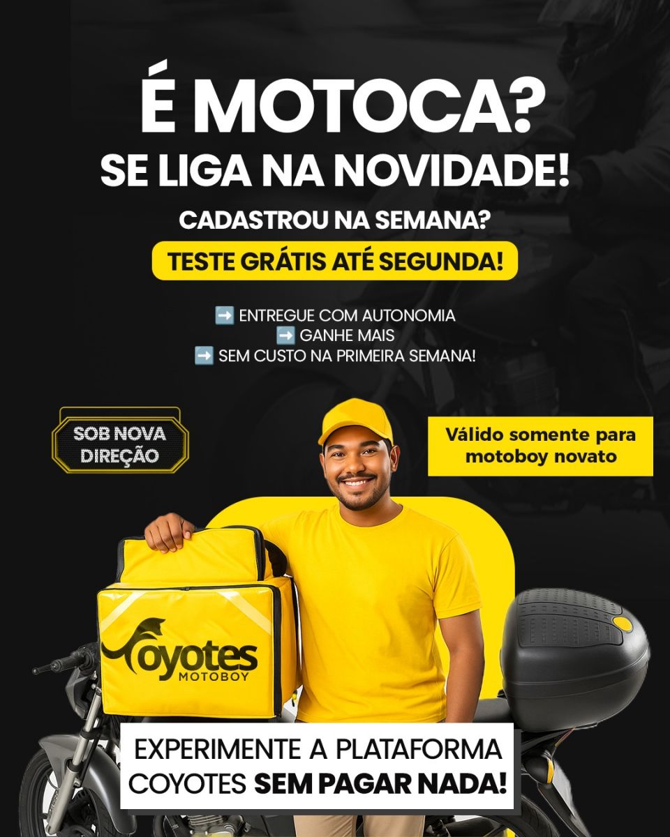 Motoboys novatos que se cadastrarem essa semana podem aproveitar uma semana de teste grátis na plataforma. Mais ágil, mais confiável e mais eficiente, agora a Coyotes oferece a mobilidade que você merece. Para entrar em contato com a Coyotes e se cadastrar como entregador, entre em contato por