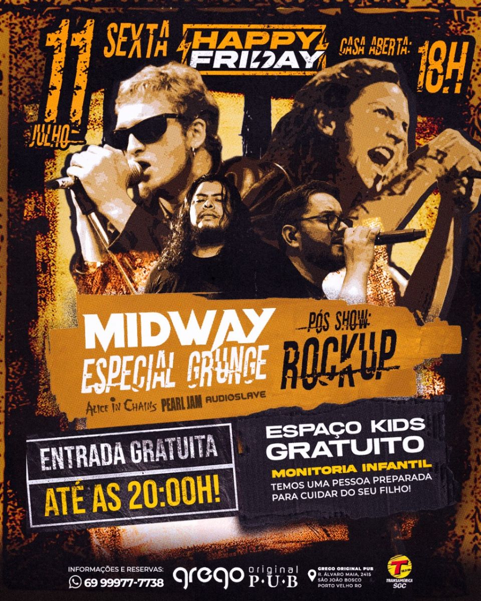 E para completar o clima, música ao vivo para embalar sua noite com o melhor do rock and roll. Essa semana teremos shows de banda Midway com especial Grunge e pós show com banda RockUp