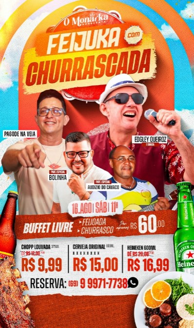 Sábado é dia de sabor e música no O Monarka. Venha curtir a Feijuka com Churrascada, buffet livre de feijoada e churrasco por apenas R$ 60,00. Feijoada caprichada, churrasco perfeitamente preparado, vatapá e guarnições de primeira.