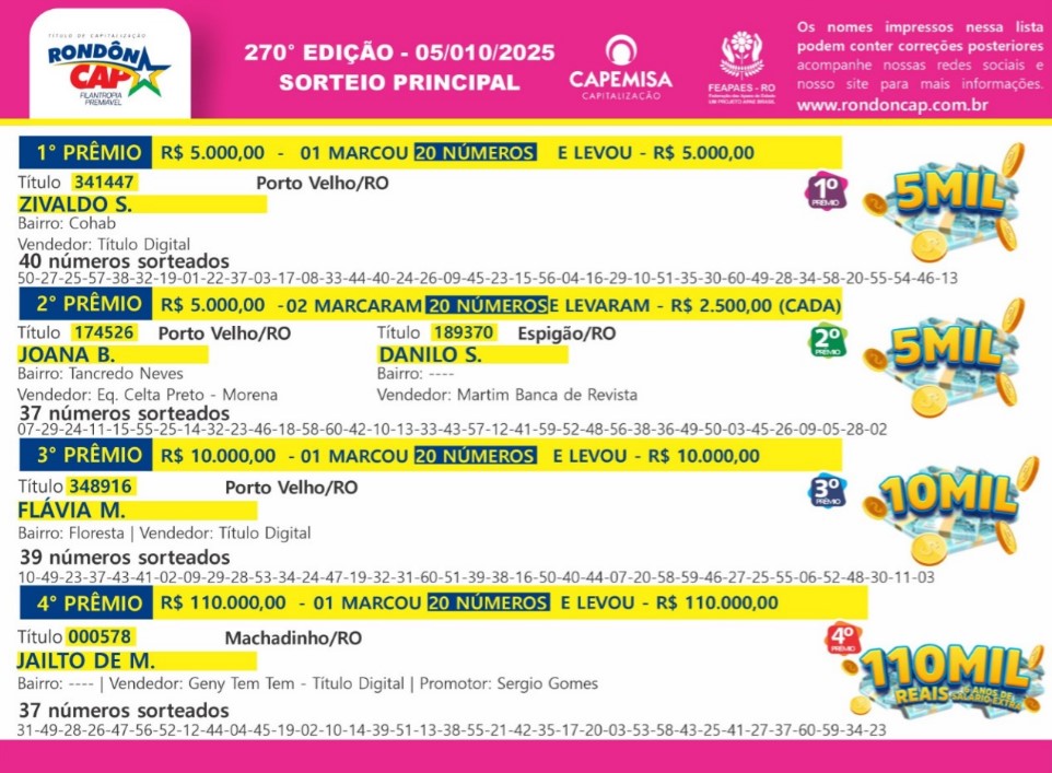 São dezenas de ganhadores em Rondônia e centenas de famílias beneficiadas nas APAES do Estado, através da Federação Estadual das Apaes, a cada domingo.