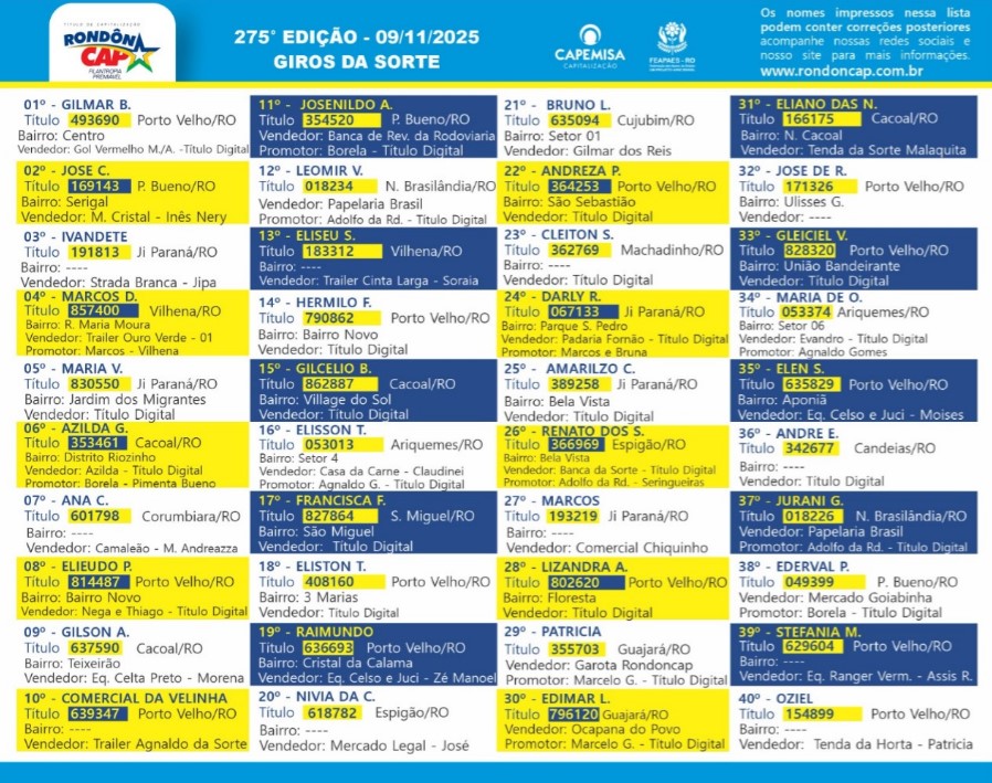 E o RondonCAP já fez muitos ganhadores em toda Rondônia, só em 2025 já são mais de 2.200 sortudos, e neste domingo serão mais de 60 ganhadores, e tem uma bolada de 100 mil no 4° prêmio e o titulo só 10 reais.