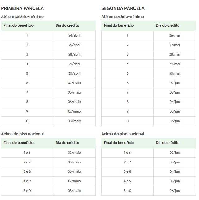 O calendário de pagamentos leva em conta o número final do cartão de benefício, sem considerar o último dígito verificador, que aparece depois do traço. O crédito da primeira parcela do abono será feito entre os dias 24 de abril a 8 de maio.