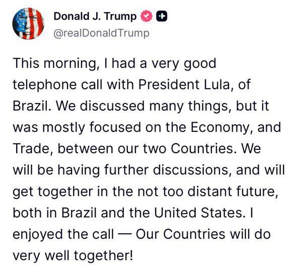“Hoje de manhã, tive uma ótima ligação telefônica com o Presidente Lula, do Brasil. Conversamos sobre muitos assuntos, mas o foco principal foi a Economia e o Comércio entre nossos dois países. Teremos novas discussões e nos encontraremos em um futuro não muito distante, tanto no Brasil quanto nos Estados Unidos. Gostei muito da conversa — Nossos países terão muito sucesso juntos!”