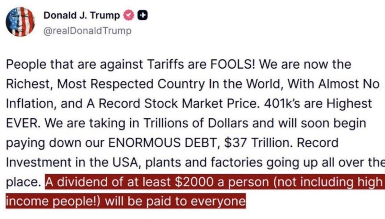 “As pessoas que são contra tarifas são tolas. Agora somos o país mais rico e mais respeitado do mundo… Em breve começaremos a pagar nossa enorme dívida. Um dividendo de pelo menos US$ 2 mil por pessoa será pago a todos”, escreveu Trump.