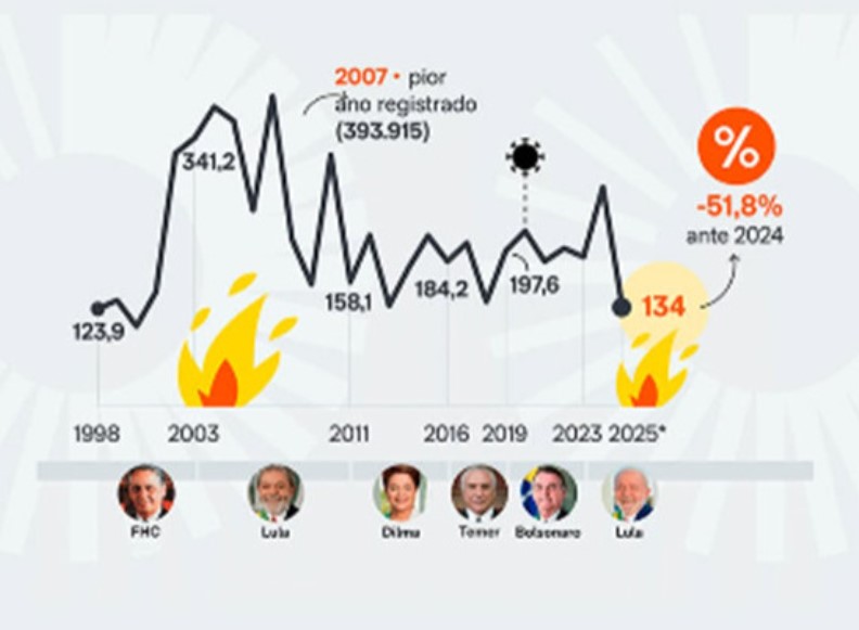 De acordo com dados do Instituto Nacional de Pesquisas Espaciais (INPE), o país registrou 134.047 focos de queimadas de 1º de janeiro a 23 de dezembro de 2025, uma queda de 51,8% em relação a 2024, quando foram contabilizados 279.299 focos. Esse número também ficou 29,4% abaixo dos registros no primeiro ano do atual governo federal.