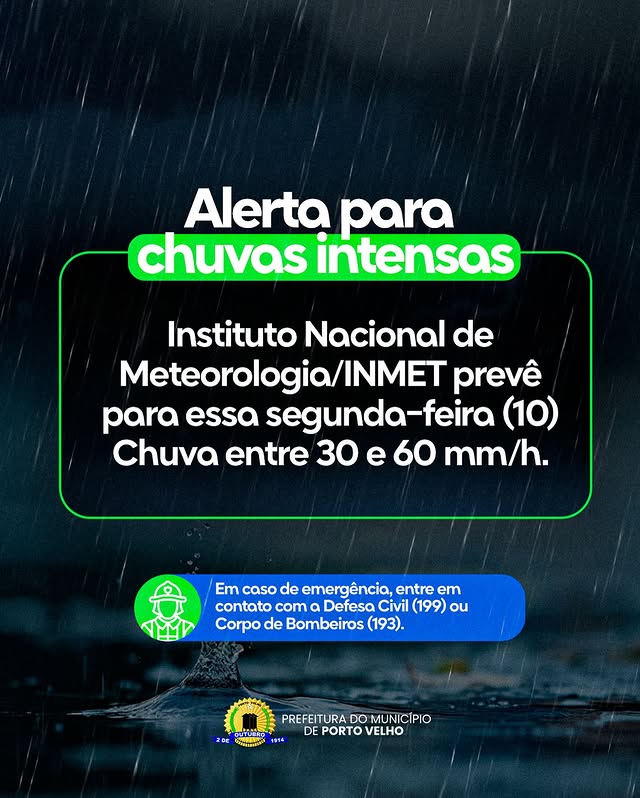 Por causa dos temporais desta segunda-feira (10), várias regiões de Porto Velho (RO) alagaram. O Instituto Nacional de Meteorologia (Inmet) alertou que a capital de Rondônia, que está classificada com um ‘alerta laranja’ de chuvas intensas, corre risco de experienciar cortes de energia, queda de galhos de árvore e descargas elétricas.