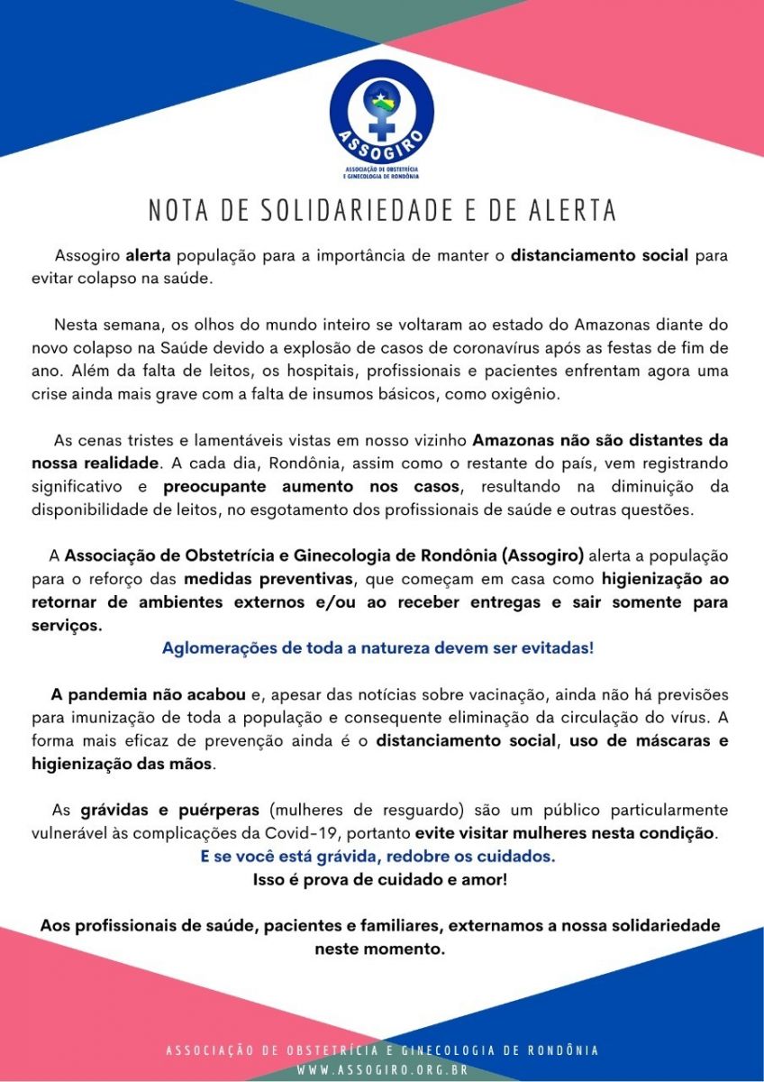 A Associação do Obstetrícia e Ginecologia de Rondônia (Assogiro) emitiu nota alertando a população de nosso estado sobre a necessidade de se fazer o distanciamento social, uso de máscaras e higienização das mãos para se tentar diminuir a propagação da covid-19.