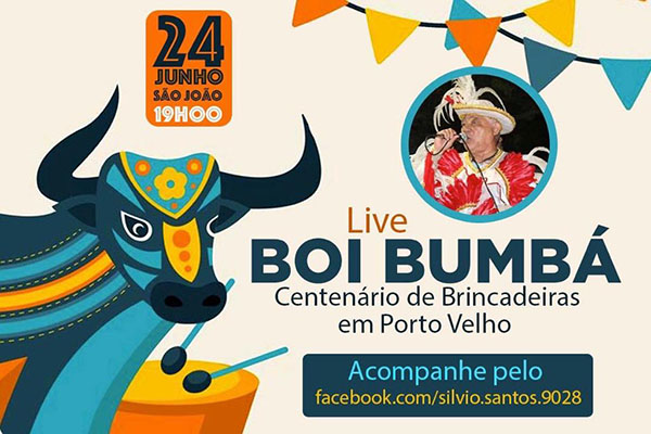 Para lembrar o centenário da “Brincadeira do Boi Bumbá em Porto Velho”, o cantor e compositor de toadas Silvio Santos realizará live nesta quarta-feira, 24, Dia de São João, para narrar a história dessa tradição que encanta os nortistas.