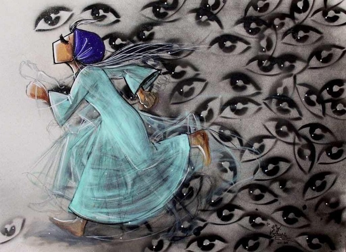 Duas delas mostram meninas em vistosos hijabs azuis sendo ameaçadas por combatentes armados. As imagens, que expressam medo extremo, desespero e repressão das mulheres afegãs, ganharam dezenas de milhares de simpatizantes no Instagram e foram compartilhadas milhares de vezes no Facebook.