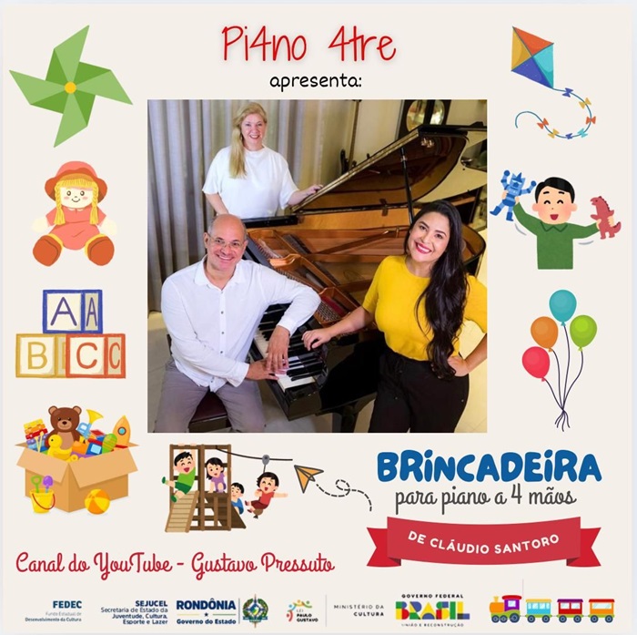 Com recursos da Lei Paulo Gustavo,via Sejucel, o projeto audiovisual “Brincadeira para Piano a 4 Mãos, de autoria de Cláudio Santoro, será executado pelos pianistas Gustavo Pressuto, Desireê Duwe e Andrea Figueiredo.