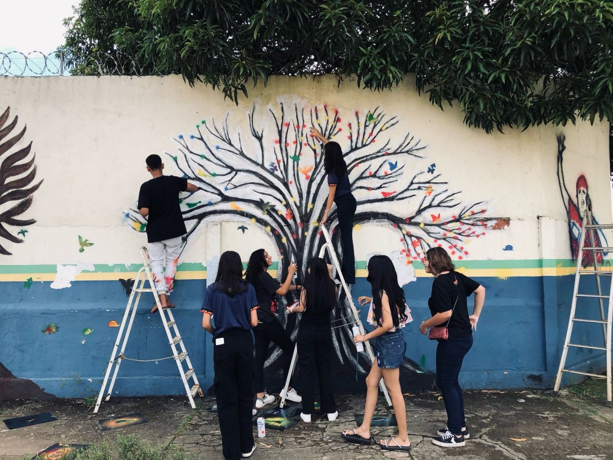 Os alunos que participaram da oficina ajudaram os artistas visuais na pintura realizada no muro da instituição de ensino.