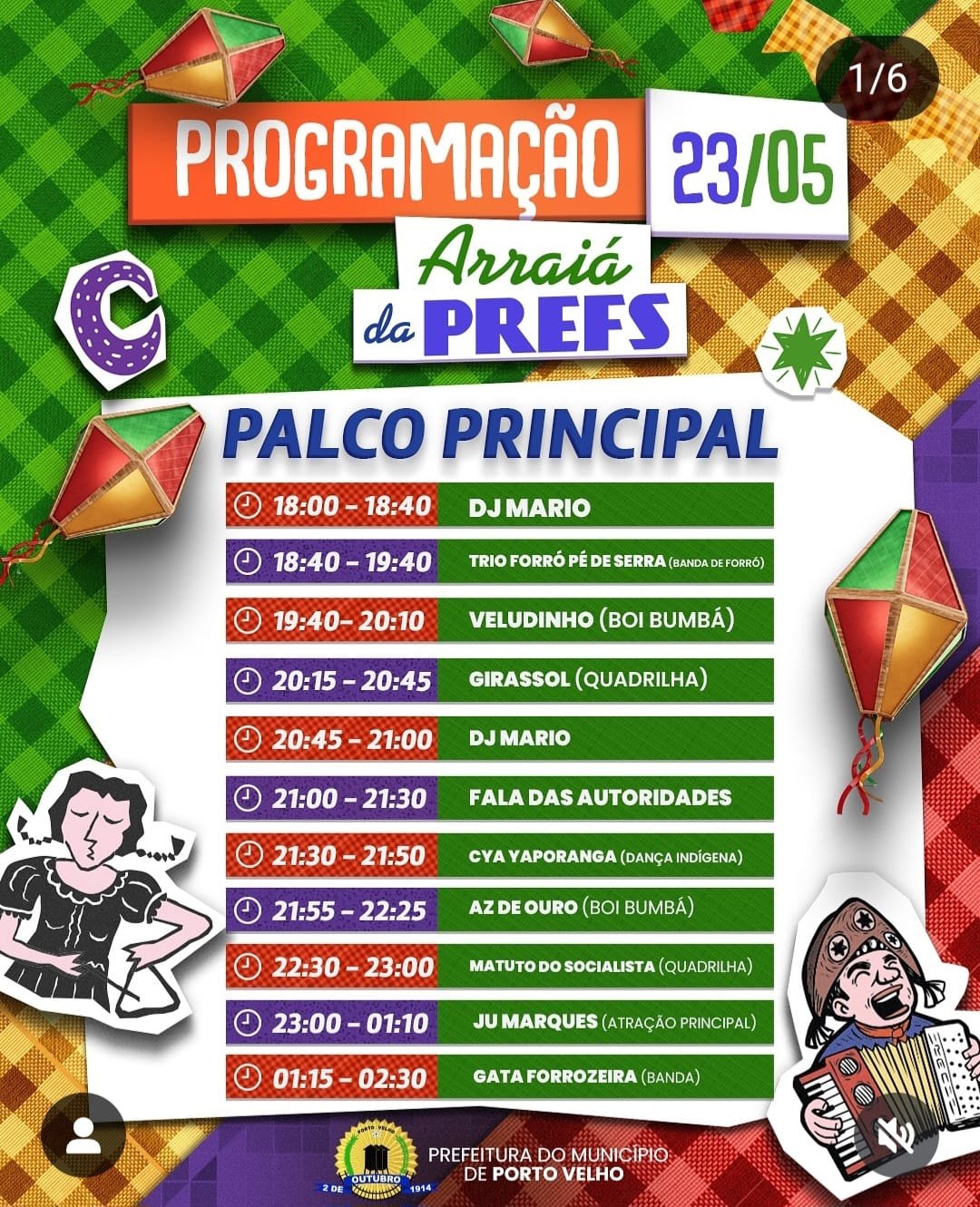 O Arraiá da Prefs inicia nesta sexta, 23/05, a partir das 18 horas, e encerra no domingo, 25/05, no Parque da Cidade, ao lado do Porto Velho Shooping. O local, segundo a Prefeitura de Porto Velho, oferece as condições ideais para receber tanto o público quanto as atrações culturais e ainda os vendedores ambulantes. Estão sendo esperadas mais de 20 mil pessoas por dia.