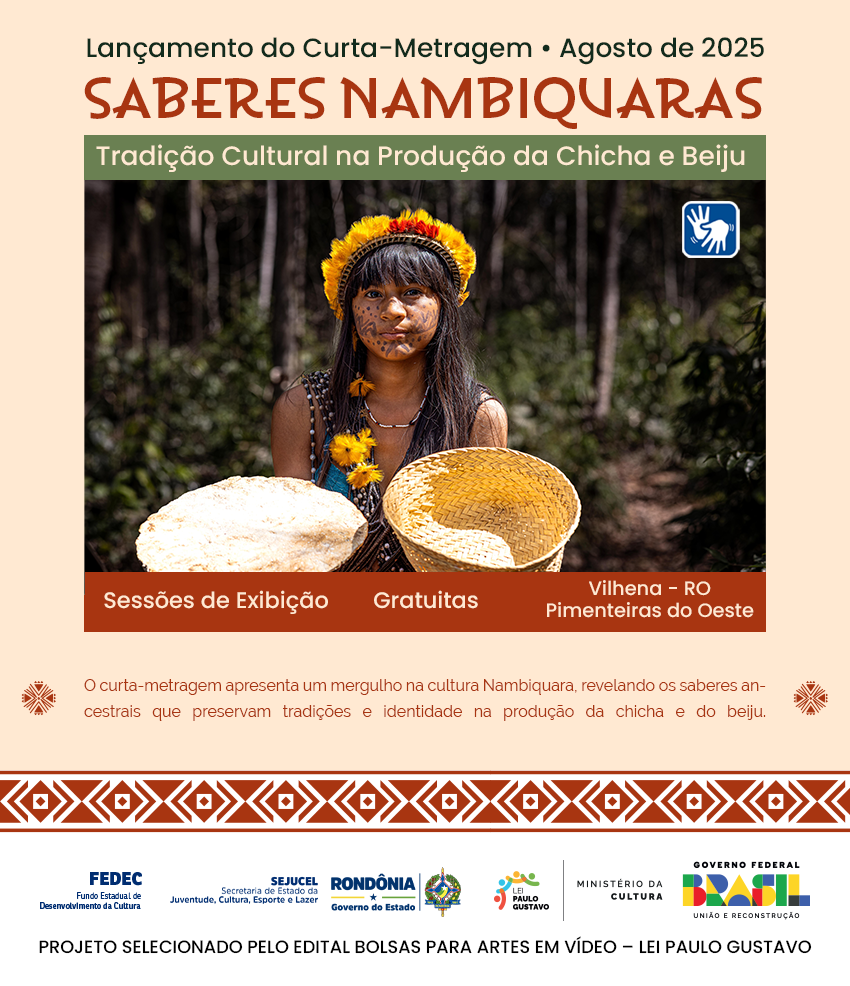 O curta-metragem 'Saberes Nambiquaras: Tradição Cultural na Produção da Chicha e Beiju', produzido em Vilhena (RO), foi disponibilizado no YouTube para acesso gratuito da população. A obra, coordenada pela produtora cultural Andressa Machado, mergulha no cotidiano e nos saberes ancestrais do povo Nambiquara, revelando práticas que preservam não apenas a gastronomia tradicional, mas também a identidade e a memória coletiva da comunidade.