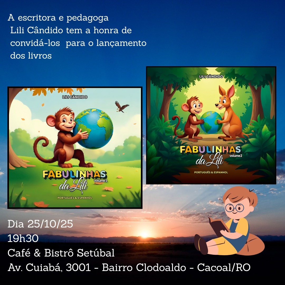 A escritora e pedagoga de Cacoal, Lili Cândido, convida o público para o lançamento dos volumes 1 e 2 da coleção 'Fabulinhas da Lilia', que chegam com edições bilíngues em português e espanhol. O evento será realizado no dia 25 de outubro, às 19h30, no Café & Bistrô Setúbal, localizado na avenida Cuiabá, nº 3001, bairro Clodoaldo, em Cacoal (RO).