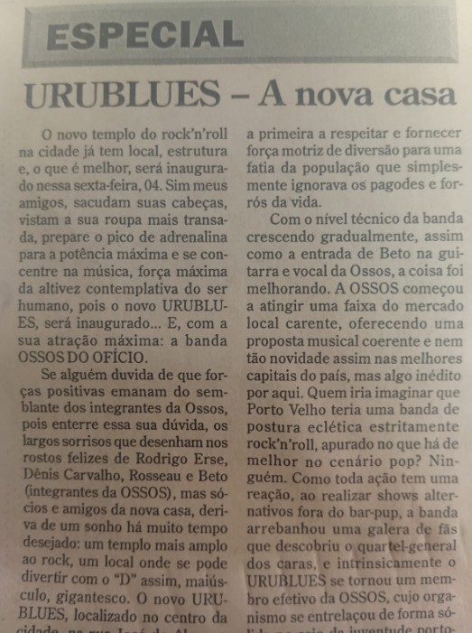Com o nível técnico da banda crescendo gradualmente, assim como a entrada de Beto, na guitarra e vocal da Ossos, a coisa foi melhorando. A OSSOS começou a atingir uma faixa do mercado local carente, oferecendo uma proposta musical coerente e nem tão novidade assim nas melhores Capitais do País, mas algo inédito por aqui. Quem iria imaginar que Porto Velho teria uma banda de postura eclética estritamente rock’n’roll, apurado no que há de melhor no cenário pop? Ninguém. Como toda ação tem uma reação, ao realizar shows alternativos fora do bar pub, a banda arrebanhou uma galera de fãs que descobriu o quartel-general dos caras e intrinsicamente o URUBLUES se tornou um membro efetivo da OSSOS, cujo organismo se entrelaçou de foram sólida no seio da juventude porto-velhense, ou seja, um não vive sem o outro (...).”