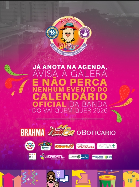 “A Banda do Vai Quem Quer já está pronta para entrar em campo com um calendário oficial de tirar o fôlego e muita festa para viver do começo ao fim. O grande desfile acontece no dia 14 de fevereiro, mas até lá tem ação, alegria, encontros e muita tradição para a gente celebrar junto. Marque na agenda e venha viver a melhor época do ano com a gente”, disse a presidente.
