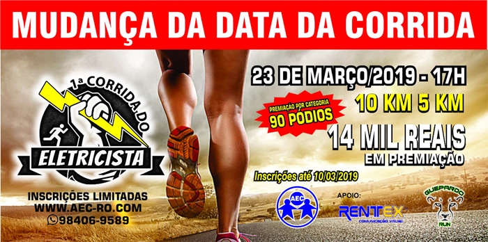 A Organização da Corrida do Eletricista comunica que a corrida foi adiada para o dia 23 de março de 2019 (sábado), às 17h00, em Porto Velho. As inscrições continuarão abertas até o dia 10/03/2019 às 23h59min no endereço eletrônico www.aec-ro.com