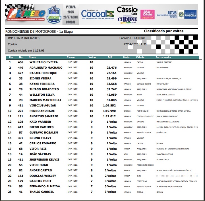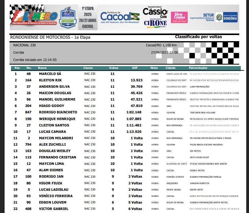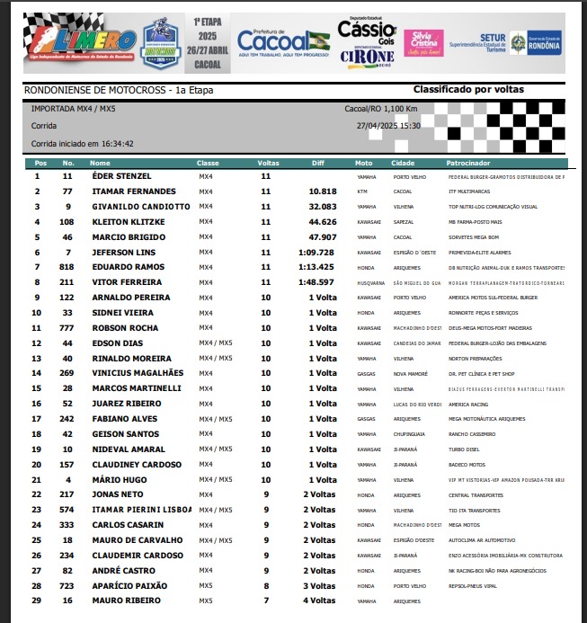 Na importada MX3, vitória do mato-grossense de Juara, piloto Romario Rosa #691, seguido de Jacson Cardoso #187 de Vilhena e em terceiro o portovelhense Eder Stenzel #11.