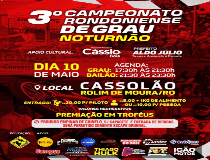 Aos amantes de motociclismo, nesse próximo sábado (10), acontecerá em Rolim do Moura o 3º Campeonato No Grau Rondoniense Noturnão, que será realizado no estádio Cassolão, no interior.