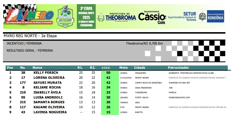 Na categoria que mais cresce no estadual, a modalidade Feminina, Kelly Persch #38 de Ariquemes liderou as duas baterias de ponta a ponta, somando 50 pontos e subiu ao lugar mais alto do pódio. Na segunda e terceira colocação duas garotas que entregam fortes emoções aos espectadores, com saltos e pilotagem agressiva. Lorena Oliveira #17 (Monte Negro) e Sayuri Murata #177 alternaram a segunda colocação nas duas baterias disputadas. Com empate na soma de pontos, prevaleceu a colocação da segunda bateria, ficando o segundo lugar do pódio com Lorena e Sayuri em terceiro. Completaram o pódio, Keliane Rocha #8 de Sena Madureira (ACRE) e a ‘prata da casa’ Isabelly Avila #210 de Theobroma. Confira resultado geral abaixo