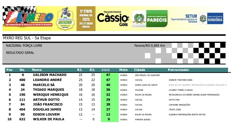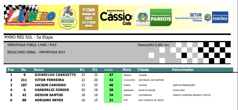 Na Importada MX3, o vilhenense Givanildo Candiotto #9 levou o pódio, em segundo ficou Vitor Ferreira #211, de São Miguel do Guaporé, e na terceira colocação ficou Jacson Cardoso #187, da cidade de Vilhena.