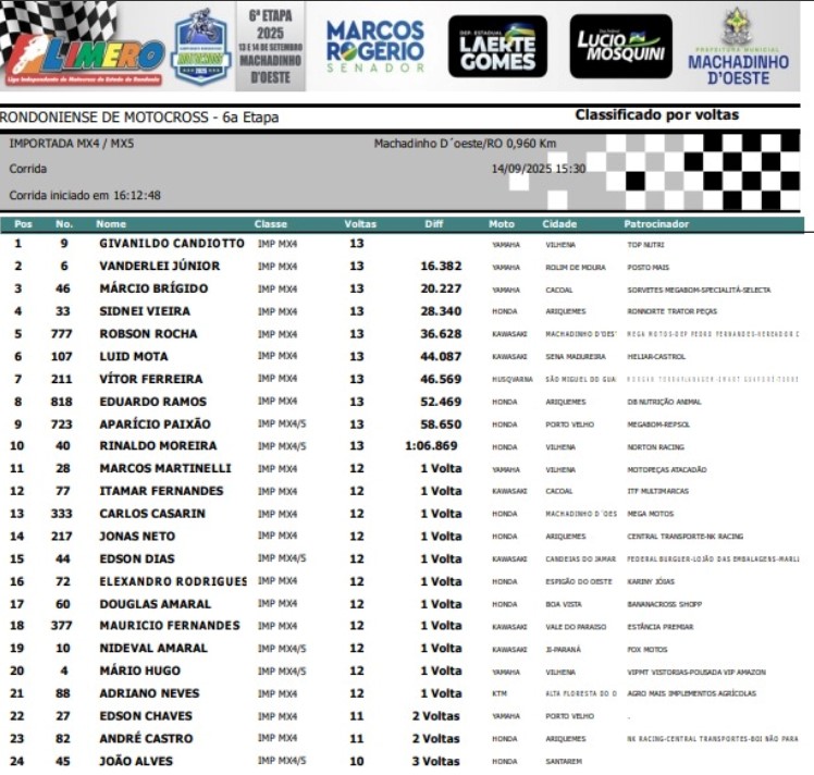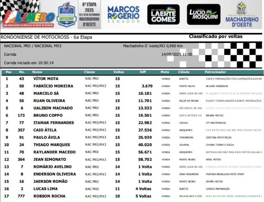 A realização foi da Prefeitura Municipal de Machadinho do Oeste em parceria com a Liga Independente de Motocross do Estado de Rondônia (LIMERO), com apoio do Senador Marcos Rogério, do Deputado Estadual Laerte Gomes, do Deputado Estadual Lucio Mosquini, Rondo Motos, Federal Burguer.