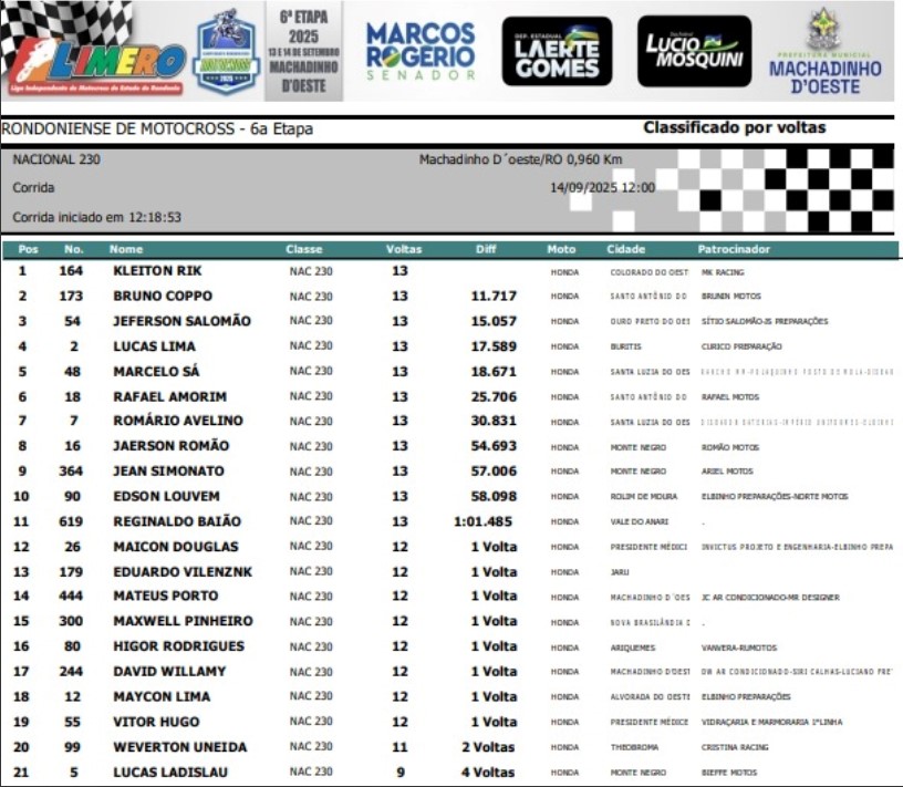Com apuração ‘on-line’ da Mancini Cronometragem que utiliza ‘Transponders’ nas motos, tem-se resultados extremante confiáveis e ao final de um domingo de muito sol e ronco alto de motores. A direção de prova foi do Everton Pereira (Thurma) e sonorização de Itamar Dalosto. A realização é de Adelmo Dias e Ana Pereira através da LIMERO.