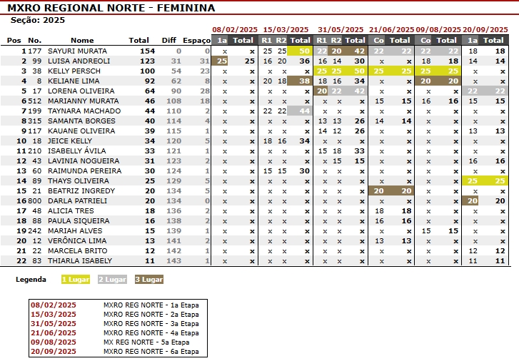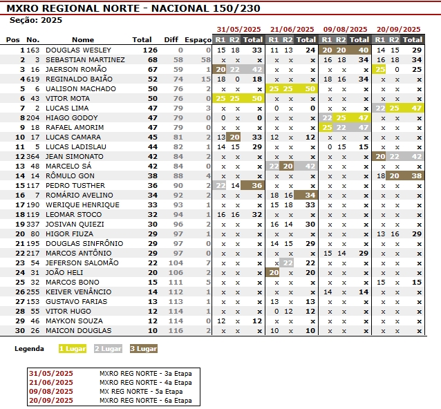 O grande destaque foi Vítor Mota (#43, Buritis), que venceu todas as etapas e conquistou o título de forma invicta, alcançando 200 pontos. O vice foi Jhoni Biavatti (#311, Nova Califórnia), com 180, enquanto Robson Rocha (#777) encerrou em terceiro com 145