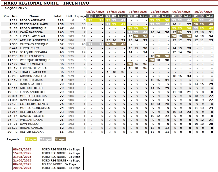 Voltada para novos talentos, a categoria Incentivo teve como campeão Pedro Andrade (#221, Nova Mutum Paraná), que somou 213 pontos. O jovem Erick Magalhães (#269, Nova Mamoré) terminou em segundo com 158, e Pedro Henrique (#33, Ariquemes) garantiu o terceiro lugar, com 147