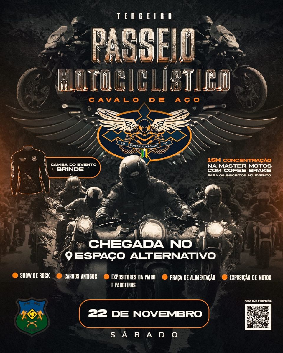 A coordenação do 3° Curso de Motociclista Policial da Polícia Militar de Rondônia, realizará no dia 22 de novembro de 2025 o 3º Passeio Motociclístico Cavalo de Aço, evento que irá aproximar os amantes do motociclismo e a comunidade da Polícia Militar, destacando o espírito de união e confraternização.