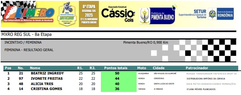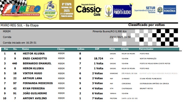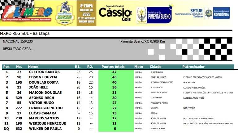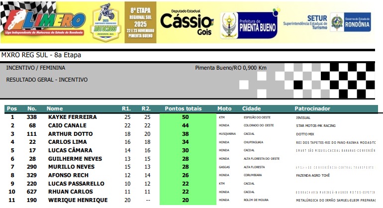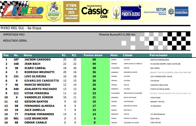 Confira abaixo os resultados por categoria da final do Regional Sul de Motocross de Pimenta Bueno.