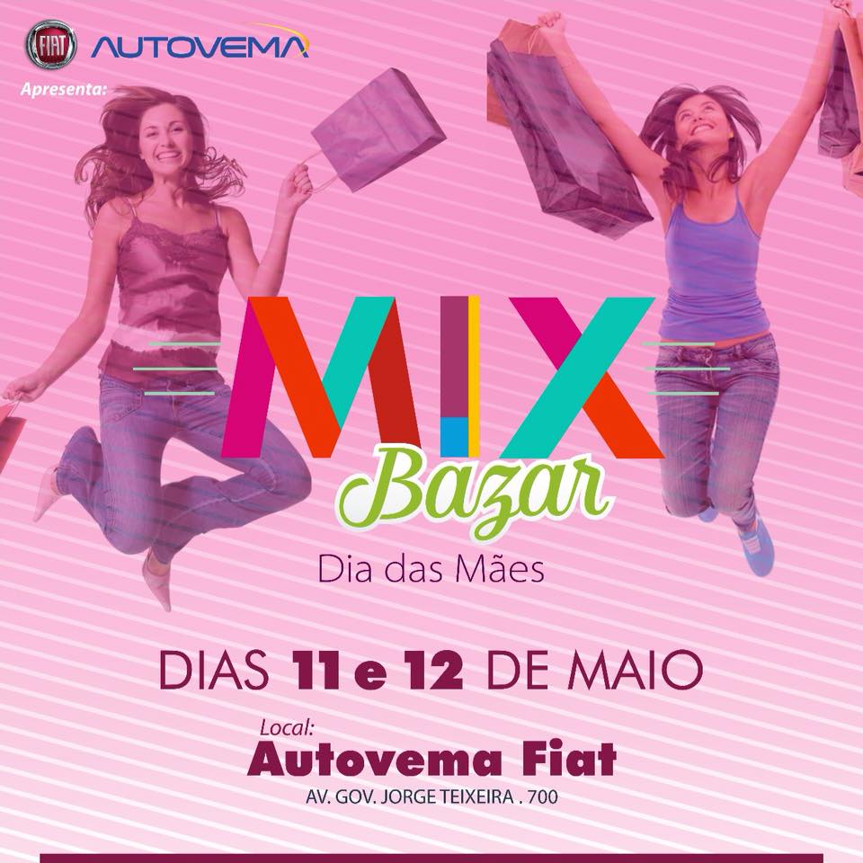 O Bazar Mix acontecerá nesta sexta-feira, 11 e sábado, 12, na Autovema Fiat, localizada na Avenida Jorge Teixeira, n° 700. O evento contará com a presença de 30 Lojas. O bazar é organizado pela Autovema Fiat.