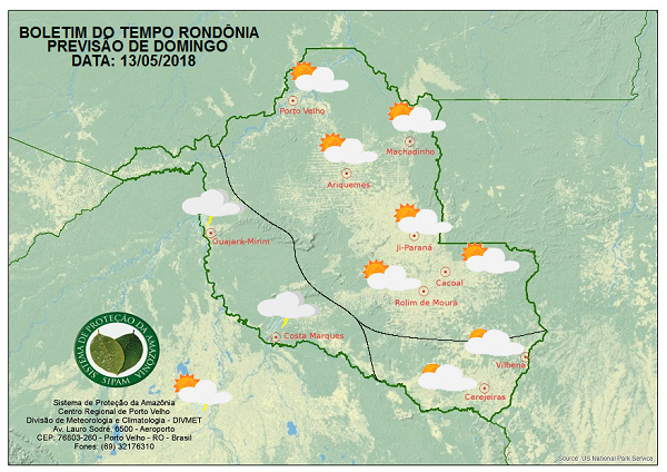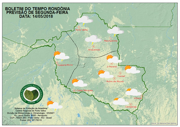 A Divisão de Meteorologia do Sistema de Proteção da Amazônia informa que nesta segunda-feira o sol aparece entre nuvens e muito mormaço na Capital e na região do Vale do Mamoré, onde a previsão é de céu variando de parcialmente nublado a nublado e entre a tarde e à noite muitas nuvens ficam carregadas e provocam pancadas de chuva com trovoadas. Nas demais regiões rondonienses a previsão é de sol forte e muito calor, com tempo variando de claro a parcialmente nublado. Porém na região do Vale do Guaporé, entre a tarde e à noite ocorrem pancadas isoladas de chuva com trovoadas.