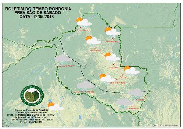 A Divisão de Meteorologia do Sistema de Proteção da Amazônia informa que o tempo muda um pouco neste fim de semana em Rondônia com a chegada de uma frente fria. No sábado o tempo ainda fica aberto nas regiões da Zona da Mata, central, Vale do Mamoré e Norte do Estado, inclusive na Capital, onde teremos muito sol e calor, poucas nuvens e possibilidade de chuva passageira a tarde. Nas cidades do extremo Sul de Rondônia e do Vale do Guaporé esta frente fria traz um evento de friagem que será de fraca intensidade, aumentando a intensidade do vento e amenizando um pouco o calor. Nestas regiões o dia será de céu nublado e poderá ocorrer chuva a qualquer hora do dia.