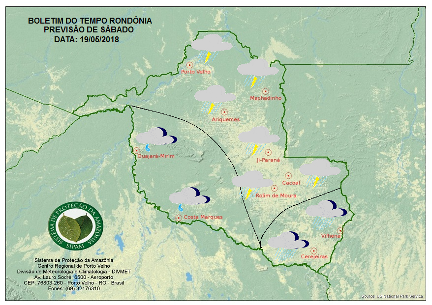 A Divisão de Meteorologia do Sistema de Proteção da Amazônia informa que mais uma massa de ar polar chega a região nesse sábado. A terceira friagem do ano chega ao sul do Estado a tarde trazendo bastante instabilidade para a região. O céu nublado já pela manhã fica encoberto conforme o sistema frontal avança, há previsão de chuva nessa região. O céu deve variar de nublado a encoberto no vale do Guaporé, podendo ocorrer chuvas ocasionais. Nas demais áreas do Estado inclusive na Capital Porto Velho, o céu deve permanecer nublado durante todo dia e há previsão de pancadas de chuvas e trovoadas a tarde, com a chegada da friagem nessa região. Para o sábado as temperaturas não devem ultrapassar os 25°C em Porto Velho.