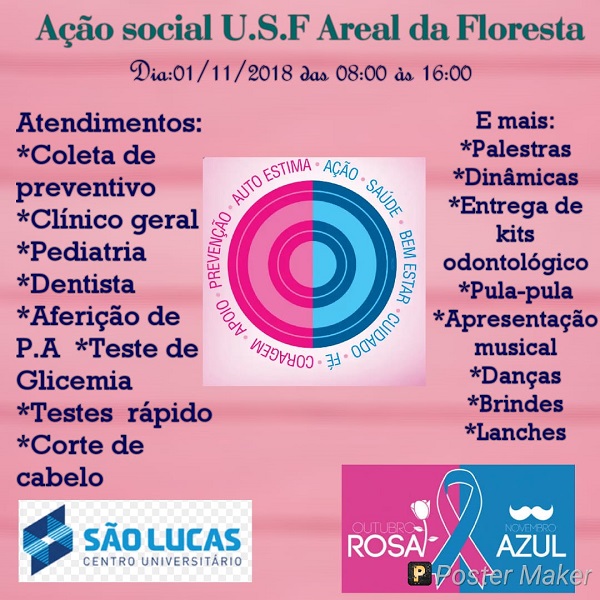 Para encerrar a campanha alusiva ao Outubro Rosa, a Secretaria Municipal de Saúde (Semusa) promoverá nesta quinta-feira, 01, das 08h00 às 17h00, na UBS Areal da Floresta, uma programação especial voltada para prevenção e promoção da saúde da mulher. A carreta do Hospital do Amor (hospital do câncer) ficará estacionada frente a unidade para fazer coleta de preventivo.