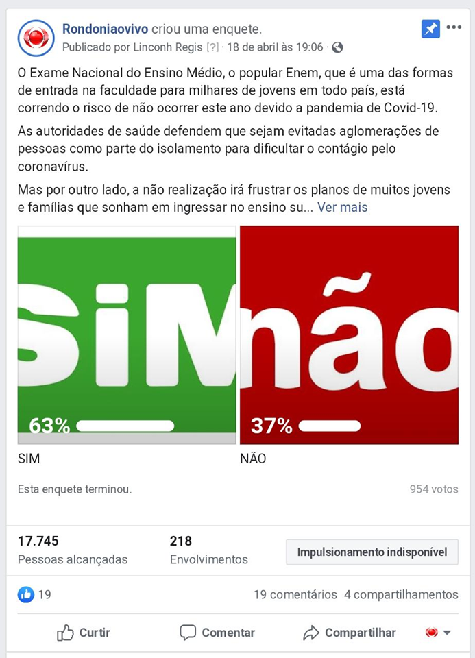 A enquete, foi ao ar no último dia 18, e contou com a participação 954 votantes, sendo que a maioria 63% marcou a opção ‘Sim’, concordando com o adiamento. Já 37% optou pelo ‘Não’, preferindo que as provas ocorram ainda este ano em todo país.