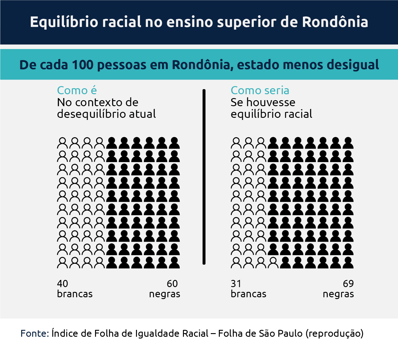 Segundo o Índice Folha de Equilíbrio Racial, Ifer, elaborado por pesquisadores, Rondônia alcança 0,217 no levantamento, em que quanto mais próximo de zero maior é o equilíbrio racial. No estado 60% dos alunos de instituições de ensino superior são pretas e pardas, quando para alcançar o equilíbrio este índice deveria ser de 69%.