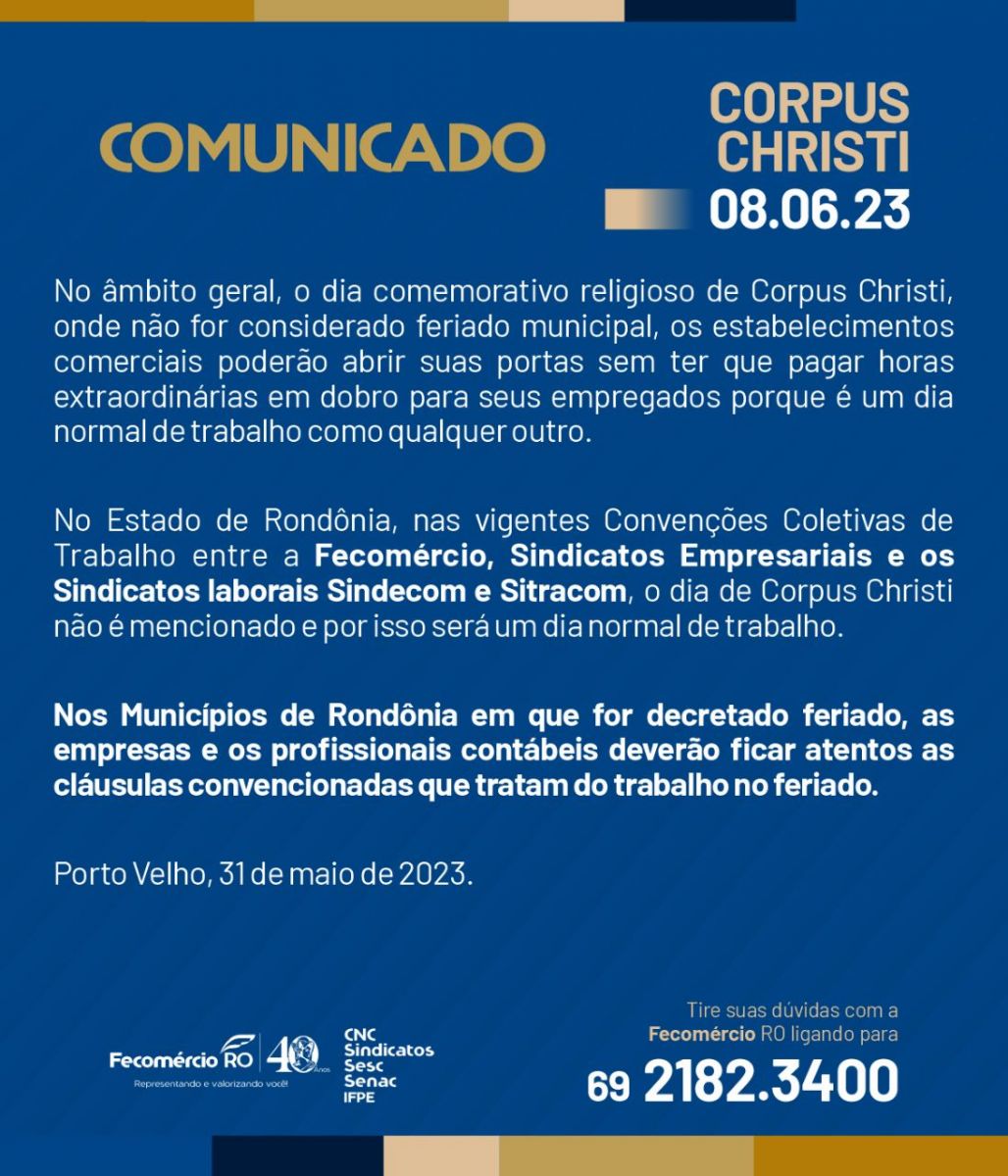No Estado de Rondônia, nas vigentes Convenções Coletivas de Trabalho entre a Fecomércio, Sindicatos Empresariais e os Sindicatos laborais Sindecom e Sitracom, o dia de Corpus Christi não é mencionado e por isso será um dia normal de trabalho.