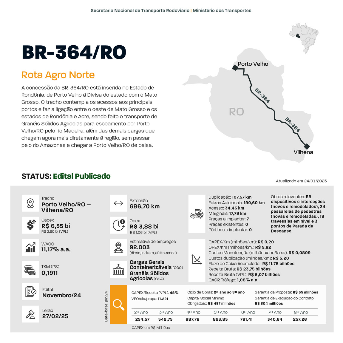 Na próxima semana, o governo Lula vai realizar o seu primeiro leilão de estradas do ano. No dia 27, a iniciativa privada poderá adquirir a concessão da BR-364, em sua extensão de 687 km, que atravessa todo o estado de Rondônia, de Vilhena até à capital, Porto Velho. Este trecho é importante corredor de escoamento de agronegócio.