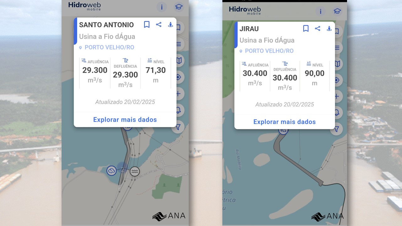 Santo Antônio apresenta nível de reservatório em 70 metros, com afluência e defluência em 29.300 metros cúbicos por segundo de vazão. Jirau está com 90 metros de nível do reservatório, com afluência e defluência de 30.400 metros cúbicos por segundo. Esses indicadores mostram que as usinas estão contendo o volume de água de forma estável.