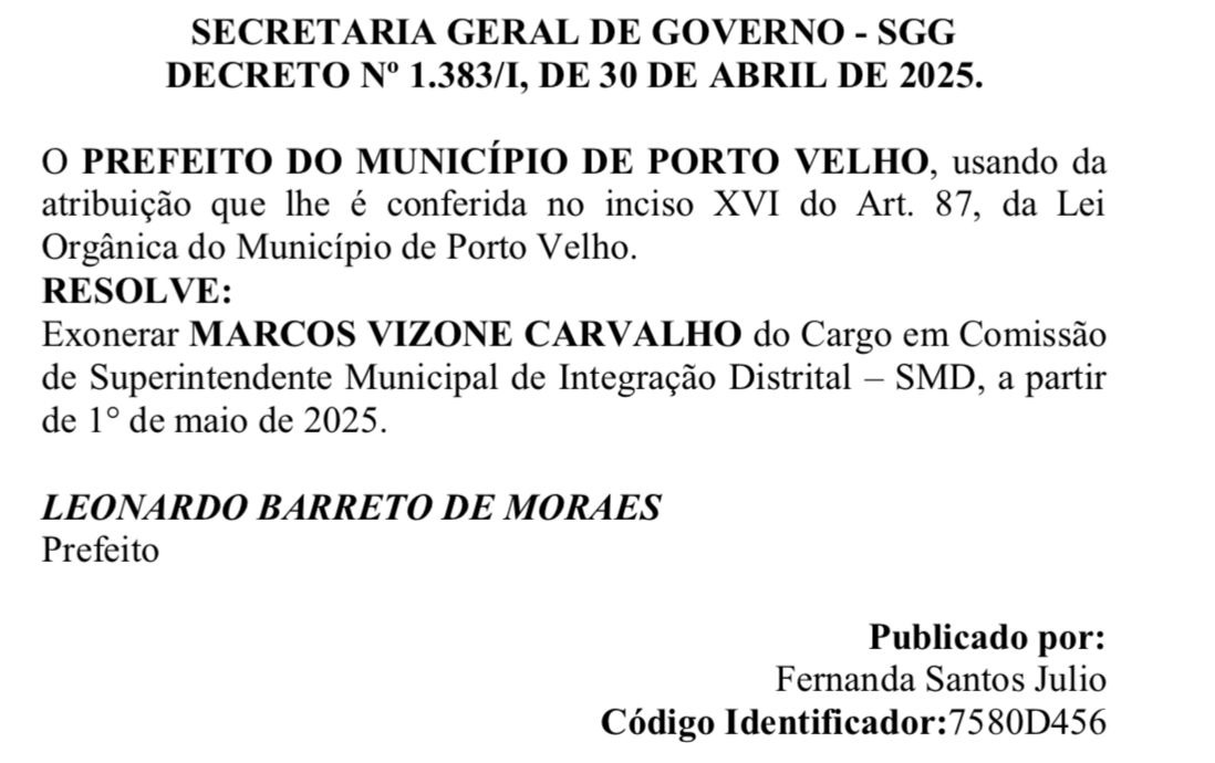 O superintendente distrital da Prefeitura de Porto Velho, Marcos Vizone, foi exonerado do cargo pelo prefeito Léo Moraes, no feriado do Dia do Trabalhador. Oficialmente, não foram revelados os motivos da dispensa dele do grupo que atua fazendo a ponte entre o paço municipal e as comunidades distritais da capital.