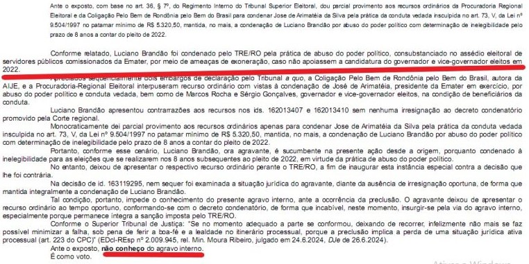 Brandão tentou recurso no TSE em Brasília (DF), mas não teve sucesso; Corte superior manteve decisão do TRE-Rondônia