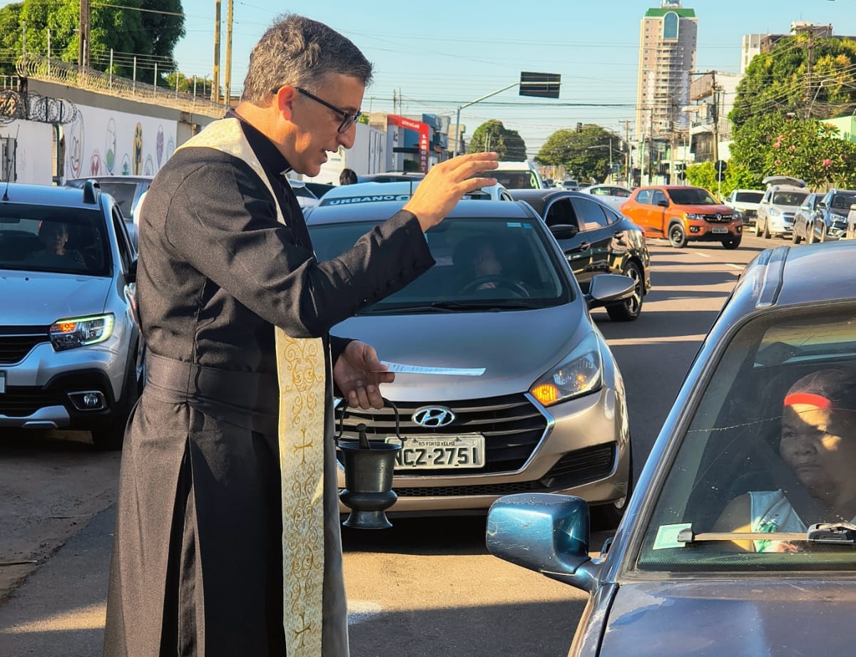 Desde a manhã e até 16 horas desta sexta-feira acontece a grande bênção dos veículos na frente da igreja pela rua Guanabara.