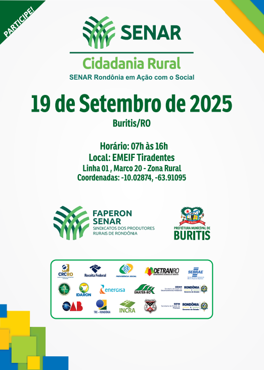 O Sistema Faperon/Senar, em parceria com o Sindicato dos Produtores Rurais de Buritis e a Prefeitura Municipal de Buritis, realiza no dia 19 de setembro de 2025, mais uma edição do programa Cidadania Rural. A ação acontecerá das 7h às 16h, na EMEIF Tiradentes, localizada na Linha 01, Marco 20, na zona rural do município.