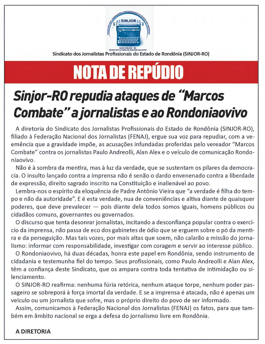 A diretoria do Sindicato dos Jornalistas Profissionais do Estado de Rondônia (SINJOR-RO), filiado à Federação Nacional dos Jornalistas (FENAJ), ergue sua voz para repudiar, com a veemência que a gravidade impõe, as acusações infundadas proferidas pelo vereador 'Marcos Combate' contra os jornalistas Paulo Andreolli, Alan Alex e o veículo de comunicação Rondoniaovivo.